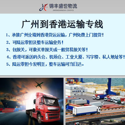深圳市錦豐盛世物流有限公司致力于打造國內(nèi)高效、快捷、安全的香港物流服務(wù)專線。主打廣州到香港物流專線,廣州到香港整車及零擔(dān)運輸,廣州到香港快件運輸,廣州到香港一般貿(mào)易出口運輸,代理報關(guān),商檢,清關(guān)及香港全境派送服務(wù)。