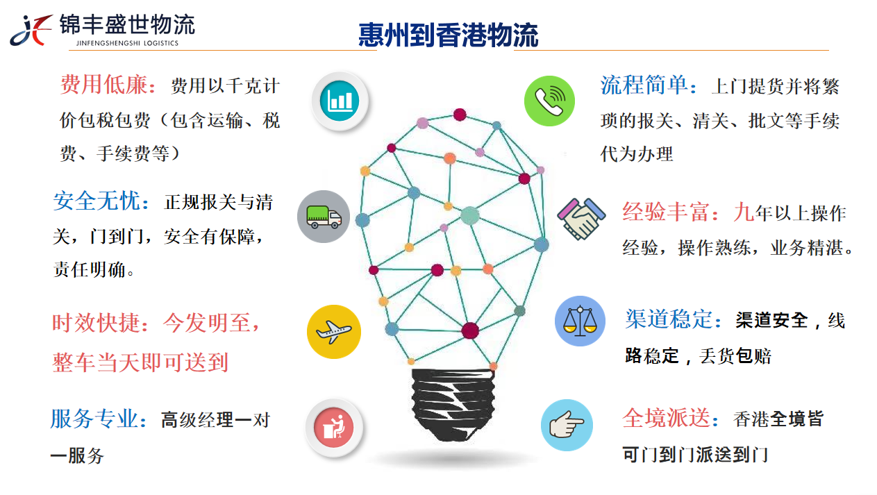 深圳市錦豐盛世物流有限公司致力于打造國內(nèi)高效、快捷、安全的香港物流服務(wù)專線。主打惠州到香港物流專線,惠州到香港整車及零擔(dān)運輸,惠州到香港快件運輸,惠州到香港一般貿(mào)易出口運輸,代理報關(guān),商檢,清關(guān)及香港全境派送服務(wù)。